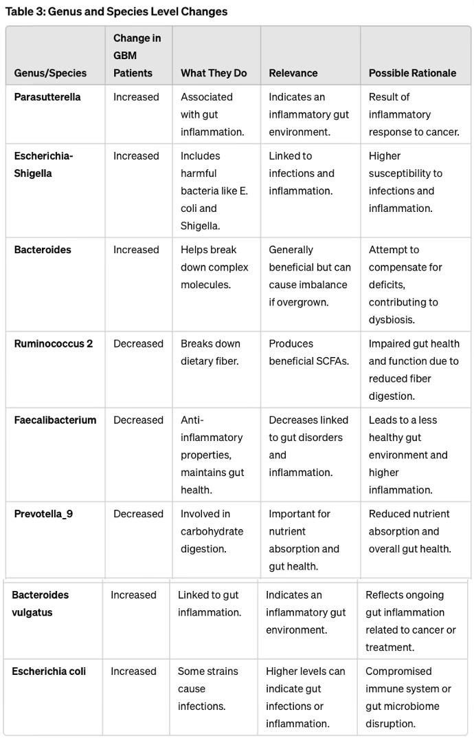 Genus and species level changes in the gut microbiome of GBM patients reveal specific increases and decreases in certain types of bacteria, in line with the general theme. Once again, changes indicate a disrupted and inflammatory gut environment with higher levels of harmful bacteria and lower levels of beneficial bacteria.