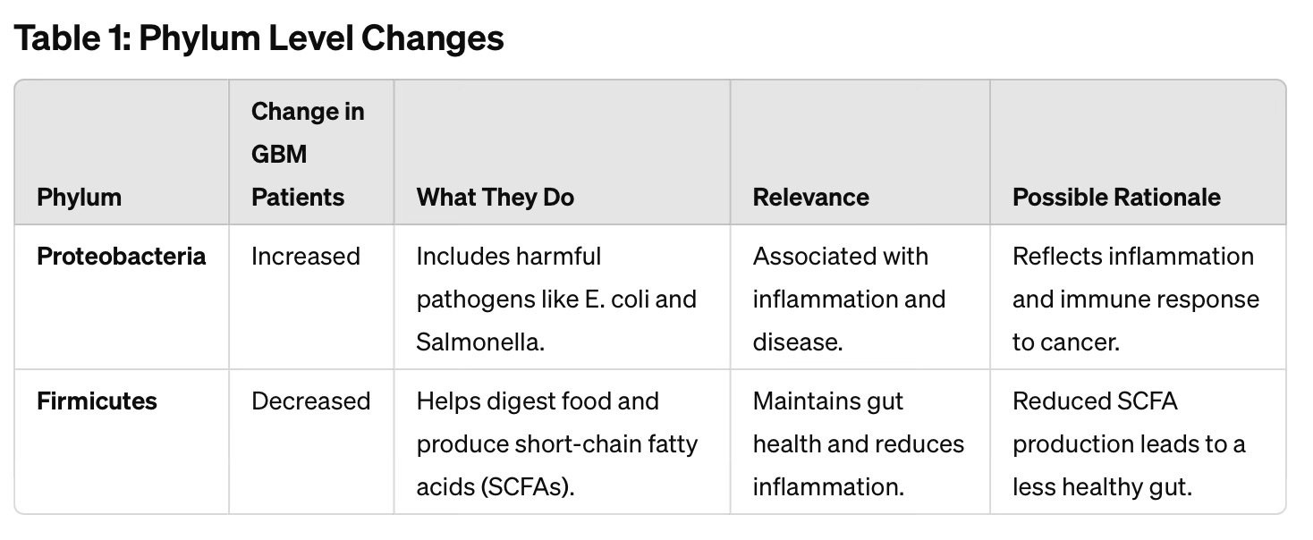 A summary of Phylum level changes in the gut microbiome of GBM patients: