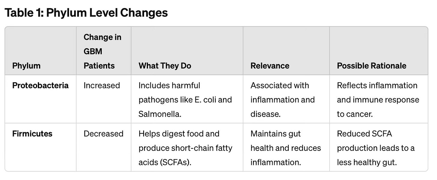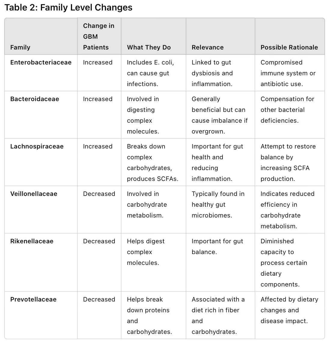 Things are getting more complicated now as we go deeper into the weeds. Family level changes in the gut microbiome of GBM patients highlight a complex interaction of increases and decreases in specific bacteria groups. The table shows that we see higher levels of bacteria associated with inflammation and infection, and lower levels of those involved in efficient digestion and nutrient absorption.