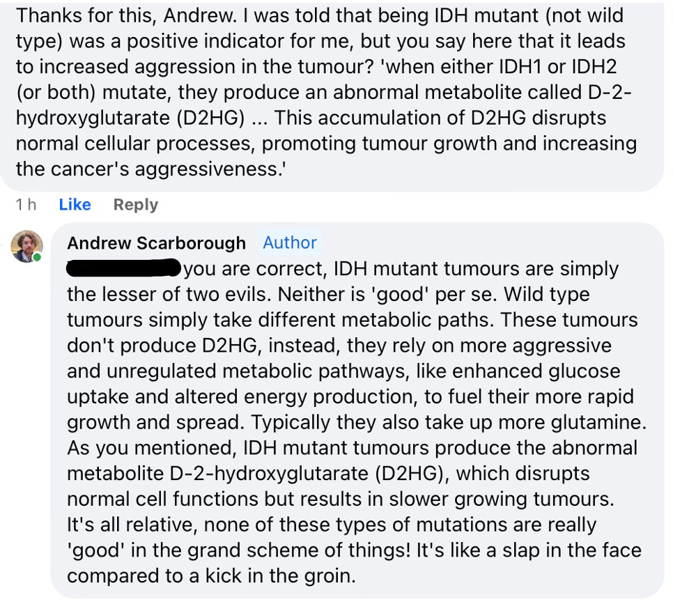 * Update - Just for clarification, I thought I would add the following commentary for those that may be confused about ‘good’ and ‘bad’ mutations. Upon sharing this article, I received a question regarding the apparent contradiction between the accumulation of D2HG in IDH mutant brain tumours, which increases cancer aggressivity and promotes tumour growth, and the fact that this mutation is traditionally considered favourable. This is an excellent question, and I realise I should have provided more explanation initially. I hope my response below helps clear up any confusion.