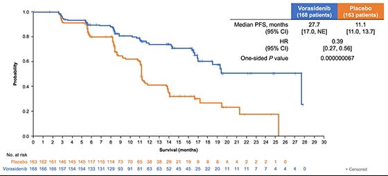Furthermore, reports indicate that Voranigo has been shown to achieve adequate levels of the drug in the central nervous system, suggesting it should be highly effective against brain tumours. We know that in the Indigo trial, Voranigo significantly extended progression-free survival (PFS) compared to placebo - as shown below - and that patients taking Voranigo showed a median PFS that was nearly double that of the placebo group.