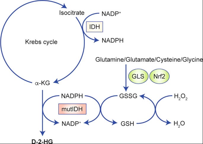 The process is quite complex, but essentially, when either IDH1 or IDH2 (or both) mutate, they produce an abnormal metabolite called D-2-hydroxyglutarate (D2HG). Under normal circumstances, these enzymes support regular cellular functions, but when mutated, they generate D2HG instead. This accumulation of D2HG disrupts normal cellular processes, promoting tumour growth and increasing the cancer's aggressiveness.